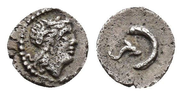 HISPANIA ANTIGUA. DIVISORES INCIERTOS. ¿Tetartemorion? A/ Cabeza laureada a der. ¿Apolo? R/ Delfín a der. dentro de creciente. AR 0,2 g. 7,3 mm. I-565; ACIP-530; CC-1044, mismo ejemplar. Porosidades. MBC.