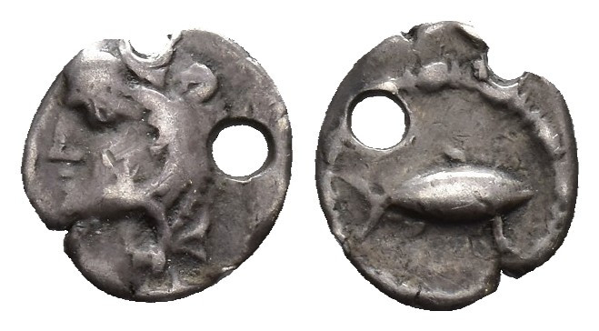 HISPANIA ANTIGUA. GADIR. Hemióbolo. A/ Cabeza de Melkart a izq. R/ Atún a der. AR 0,40 g. 8,5 mm. I-1310; ACIP-636; CC-287, mismo ejemplar. Dos agujeros. MBC-. Rara.