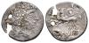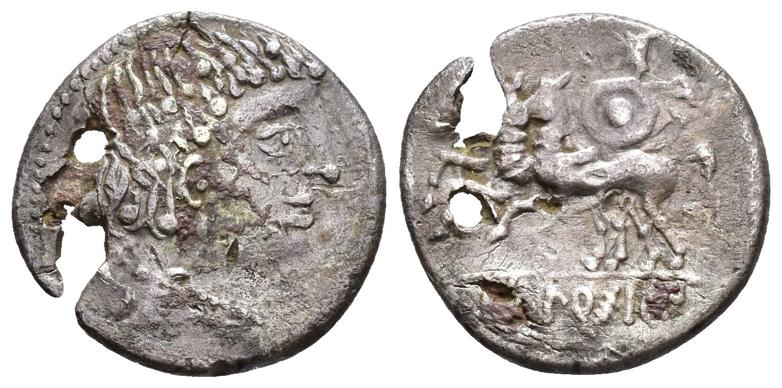 HISPANIA ANTIGUA. IKALESKEN. Denario forrado. A/ Cabeza masculina con collar a der. R/ Jinete con clámide, rodela y dos caballos a izq., en exergo (Ika)LESKeN. AR 3,07 g. 20,1 mm. I-1397; ACIP-2074; CC-2432, mismo ejemplar. Agujero y rotura. BC+.