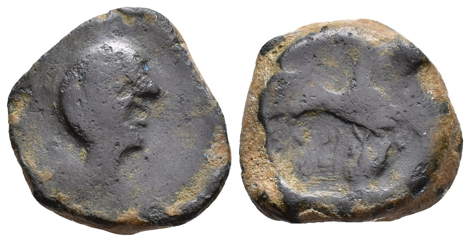 HISPANIA ANTIGUA. OBA. Mitad. A/ Cabeza masculina a der. R/ Caballo galopando a der., debajo ¿ywʿbʿl? AE 9,03 g. 20,3 mm. I-1776 var.; ACIP-951; CC-709, mismo ejemplar. BC-/RC. Rarísima.