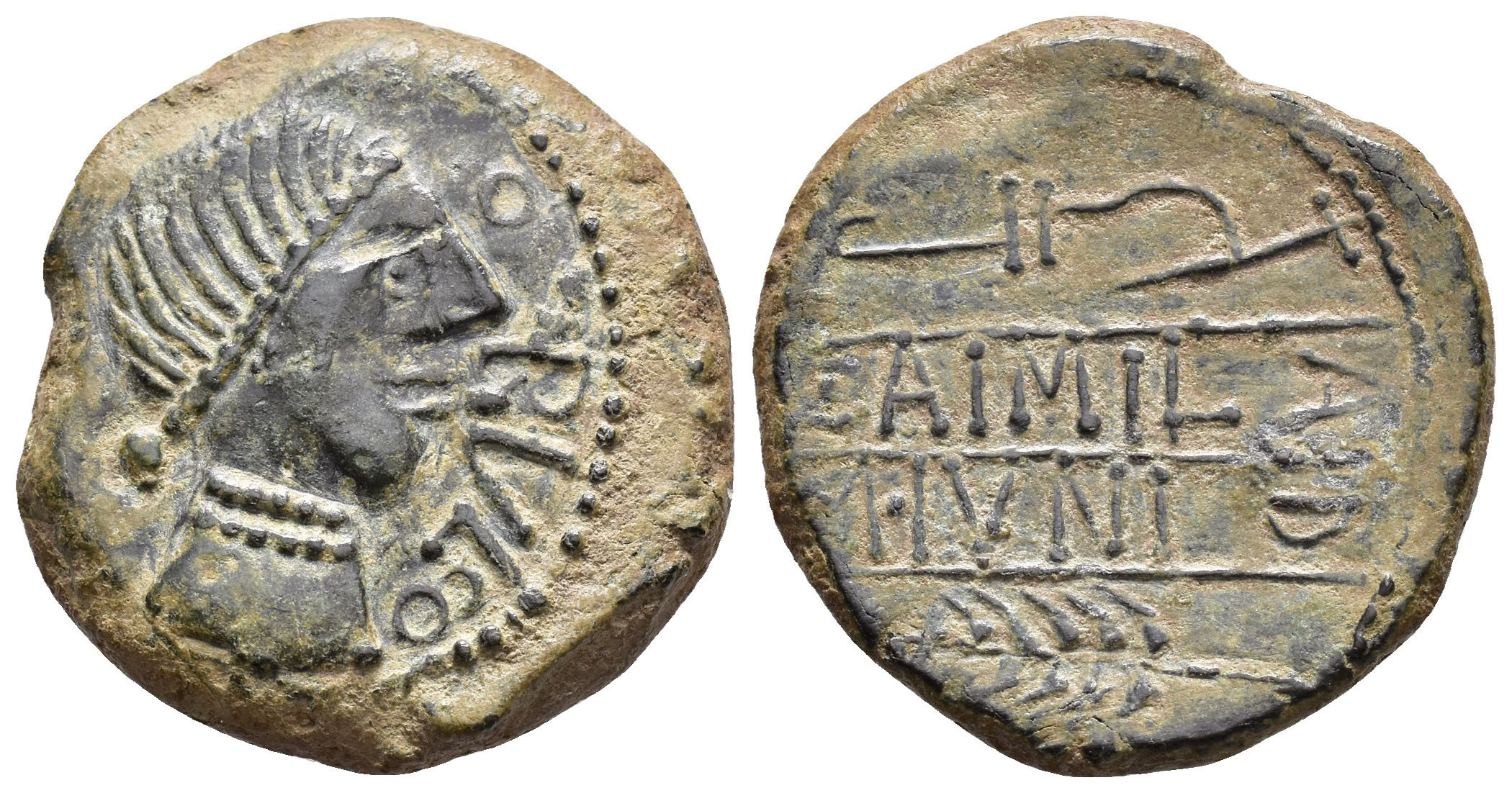 HISPANIA ANTIGUA. OBULCO. Unidad. A/ Cabeza femenina con moño a der.; OBVLCO. R/ Arado y espiga, en medio L AIMIL/ M IVNI/AID. AE 15,46 g. 28,8 mm. I-1807; ACIP-2222. Anv. algo descentrado. Pátina verde oscuro. MBC+.