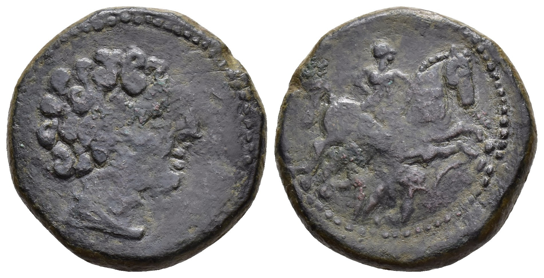 HISPANIA ANTIGUA. OLONTIGI. Unidad. A/ Cabeza masculina a der. R/ Jinete a der., debajo ley. púnica l'nt. AE 13,34 g. 25,3 mm. I-1875; ACIP-853; CC-721, mismo ejemplar. Pátina oscura. BC+. Muy escasa.