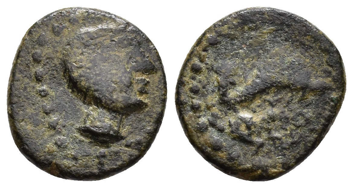 HISPANIA ANTIGUA. OLONTIGI. Cuarto. A/ Cabeza masculina a der. R/ Delfín a der., OLO-(NT). AE 2,7 g. 15,8 mm. I-1885; ACIP-867; CC-746, mismo ejemplar. BC+/RC. Rarísima.