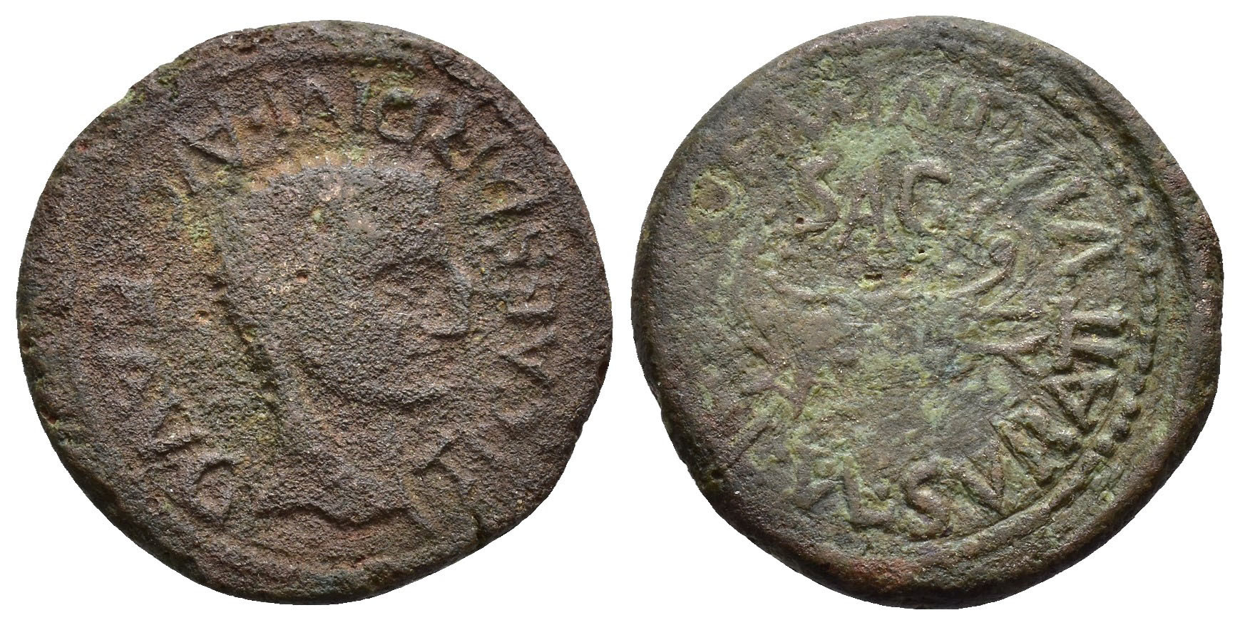 HISPANIA ANTIGUA. ARSE-SAGUNTUM. Tiberio. Semis. A/ Cabeza a der.; TI CAESAR DIVI AVG F AVG. R/ Galera a der., encima SAG; L SE GEMINO L VAL SVRA II VIR. AE 5,96 g. 23 mm.I-no. APRH-203; ACIP-3238; CC-4462, mismo ejemplar. Superficies erosionadas. BC-. Muy rara.