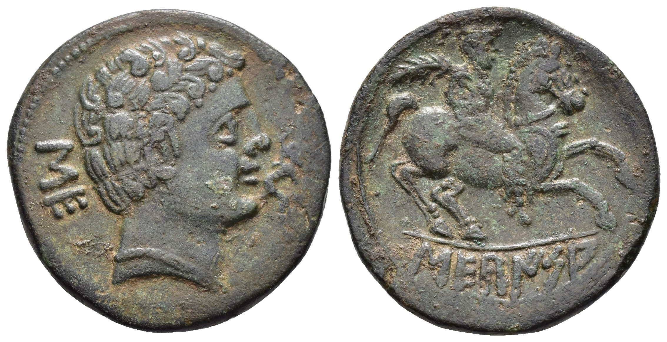 HISPANIA ANTIGUA. SEKAISA. Unidad. A/ Cabeza masculina con collar a der., delante delfín, detrás SE. R/ Jinete con palma a der., en exergo SEKaISA. AE 12,78 g. 30,7 mm. I-2121; ACIP-1544; CC-2212. Pátina verde. MBC.