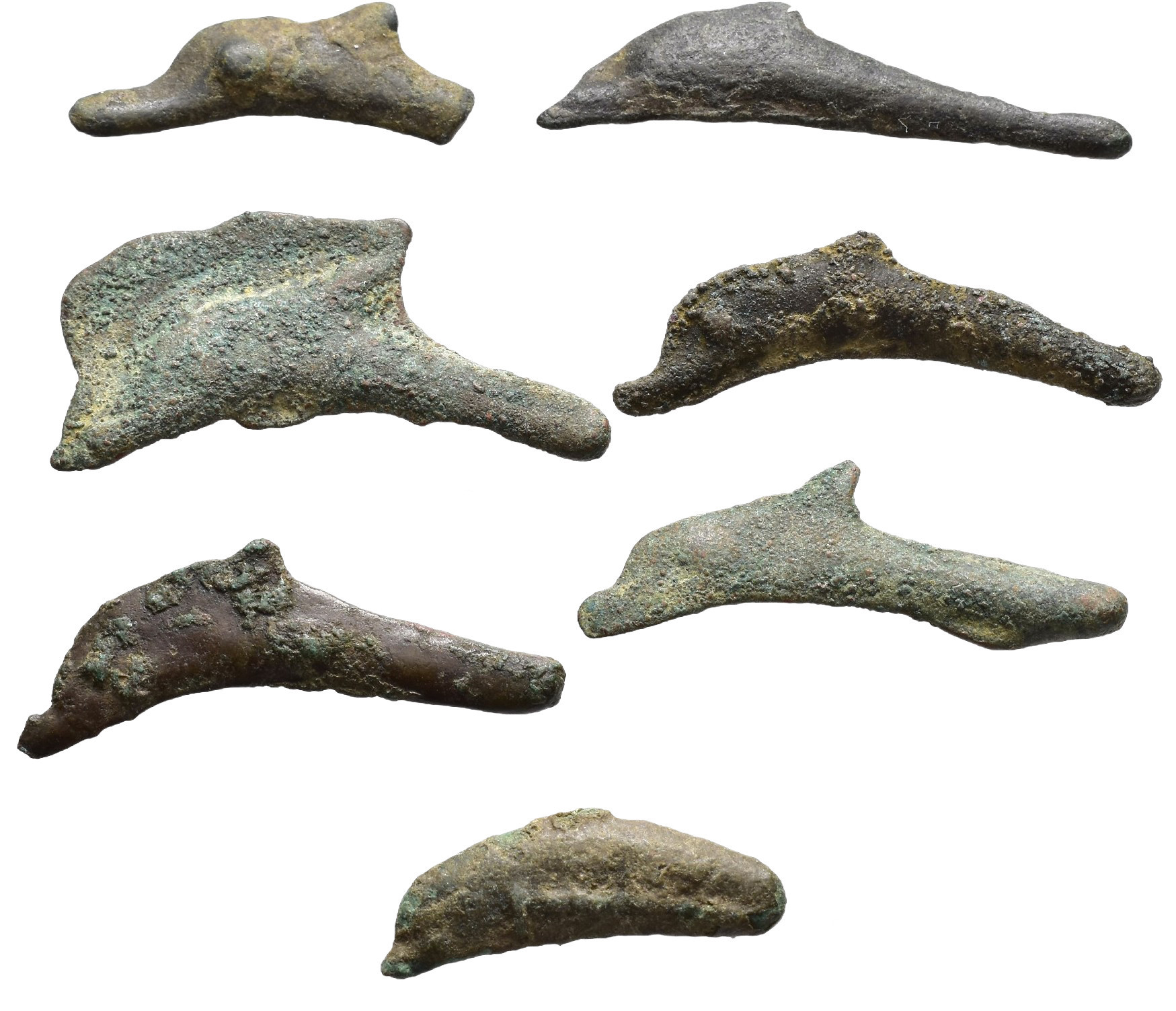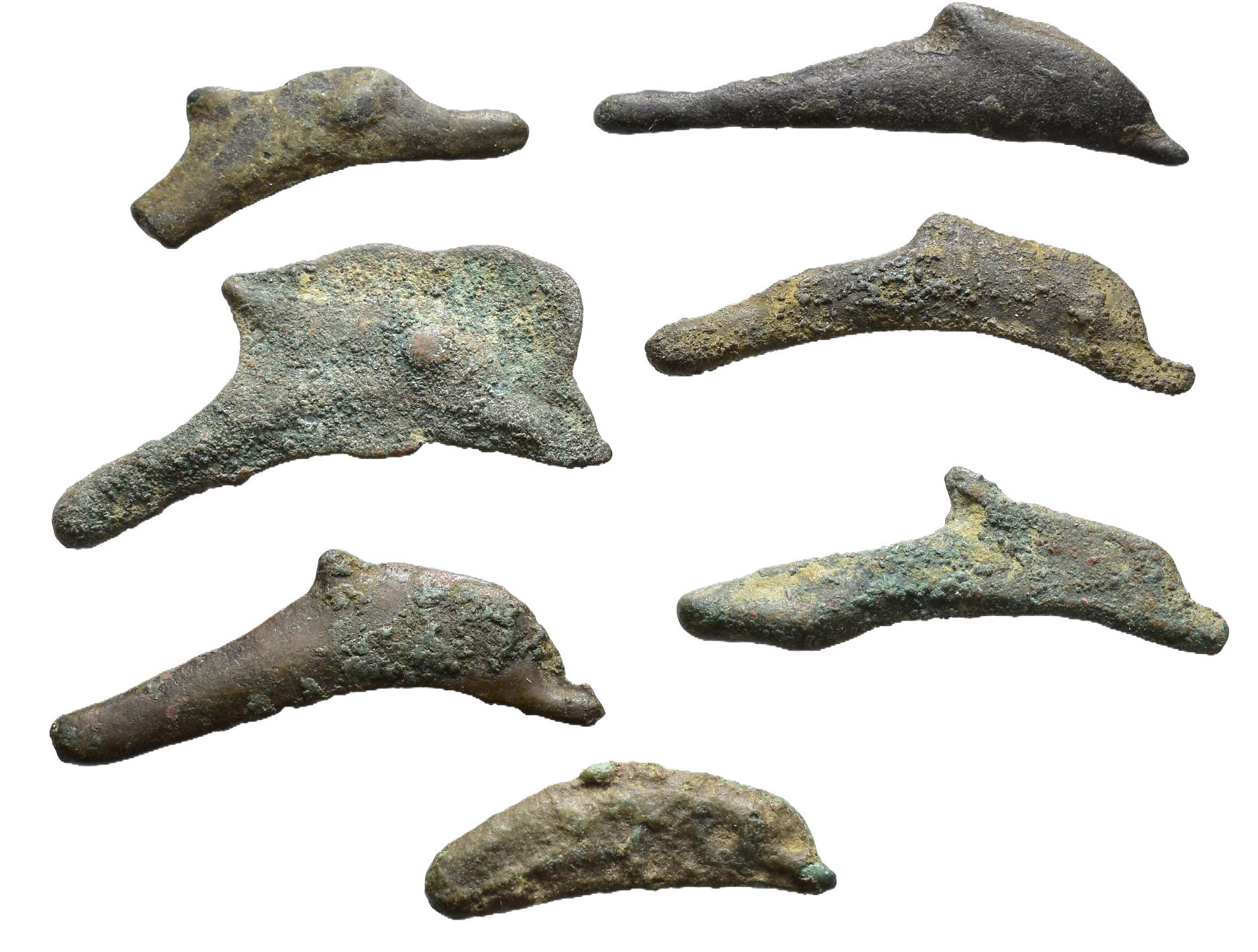 GRECIA ANTIGUA. Escitia. Lote de 7 monedas-delfín. A 2 les falta fragmento. Pátina verde. MBC.
