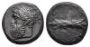 GRECIA ANTIGUA. SICILIA. Siracusa. AE. Dilitron (Timóleón, 315-317 a.C.). A/ Cabeza de Zeus a izq.; ley. griega poco visible. R/ Haz de rayos; (SYRAK)OSUWN. AE 4,49 g. 15 mm. COP-730. Pátina verde oscuro. MBC+/MBC.