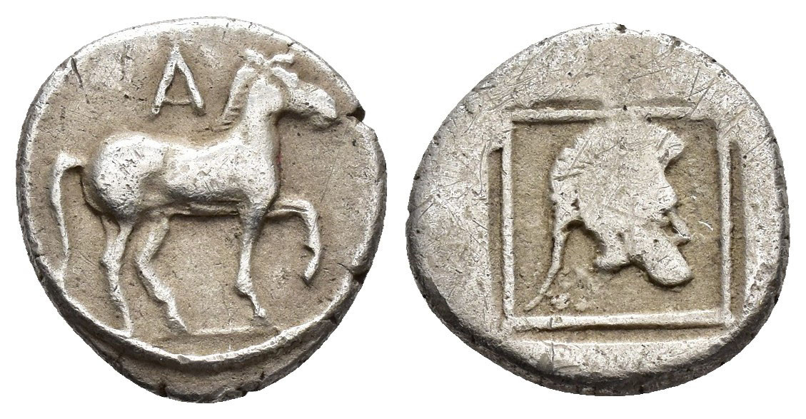 GRECIA ANTIGUA. MACEDONIA. Alejandro I. Tetróbolo (498-454 a.C.). A/ Caballo al paso a der., encima A. R/ Cabeza con casco de cimera a der. AR 2,26 g. 15,1 mm. COP-489. MBC-/BC.