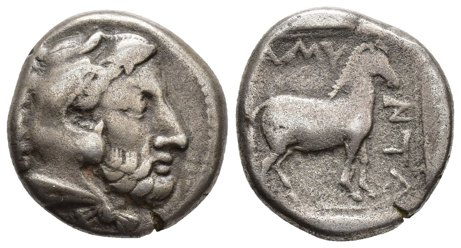GRECIA ANTIGUA. MACEDONIA. Amintas III. Didracma (389-383 a.C.). A/ Cabeza de Heracles con leonté a der. R/ Caballo a der. en cuadrado incuso; AMY-NTA. AR 9,09 g. 21,1 mm. COP-512. MBC-/BC+.