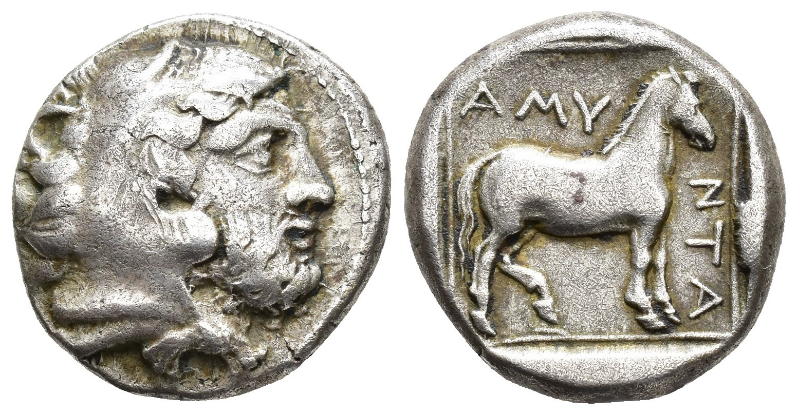GRECIA ANTIGUA. MACEDONIA. Amintas III. Didracma (389-383 a.C.). A/ Cabeza de Heracles con leonté a der. R/ Caballo a der. en cuadrado incuso; AMY-NTA. AR 9,32 g. 21,1 mm. COP-512. MBC-.