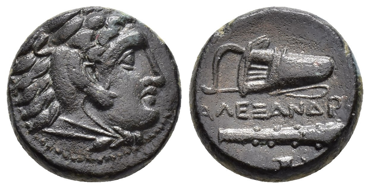 GRECIA ANTIGUA. MACEDONIA. Alejandro III. AE (c. 336-323 a.C.). A/ Cabeza de Heracles con leonté a der. R/ Maza y carcaj, debajo monograma poco visible. AE 5,4 g. 16,3 mm. Price-335. Pátina verde oscuro. EBC-.