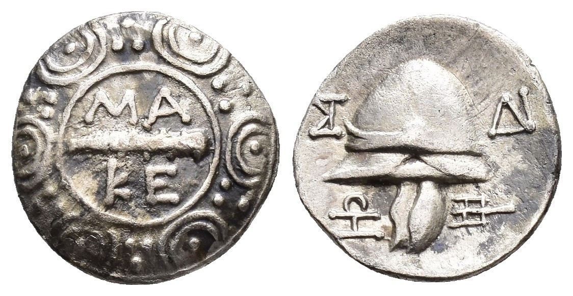 GRECIA ANTIGUA. MACEDONIA. Pella o Anfípolis. Tetróbolo. Época de Filipo V y Perseo (187-168 a.C.). A/ Escudo macedonio rodeando maza; MA/KE. R/ Casco macedonio a izq., tres monogramas y tridente. Ar 2,53 g. 15 mm. COP-1283. Leves erosiones. MBC/MBC+.