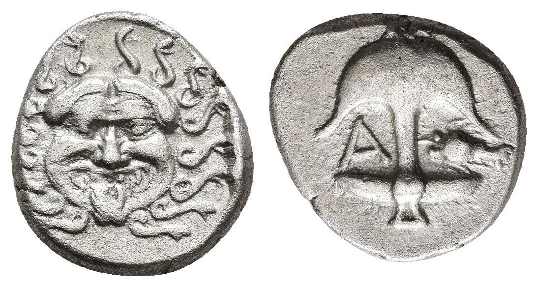 GRECIA ANTIGUA. TRACIA. Apolonia Póntica. Dracma (c. 450-440 a.C.). A/ Gorgoneion. R/ Ancla entre A y cangrejo. AR 3,23 g. 14,9 mm. COP-456; SBG-1655.MBC.