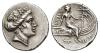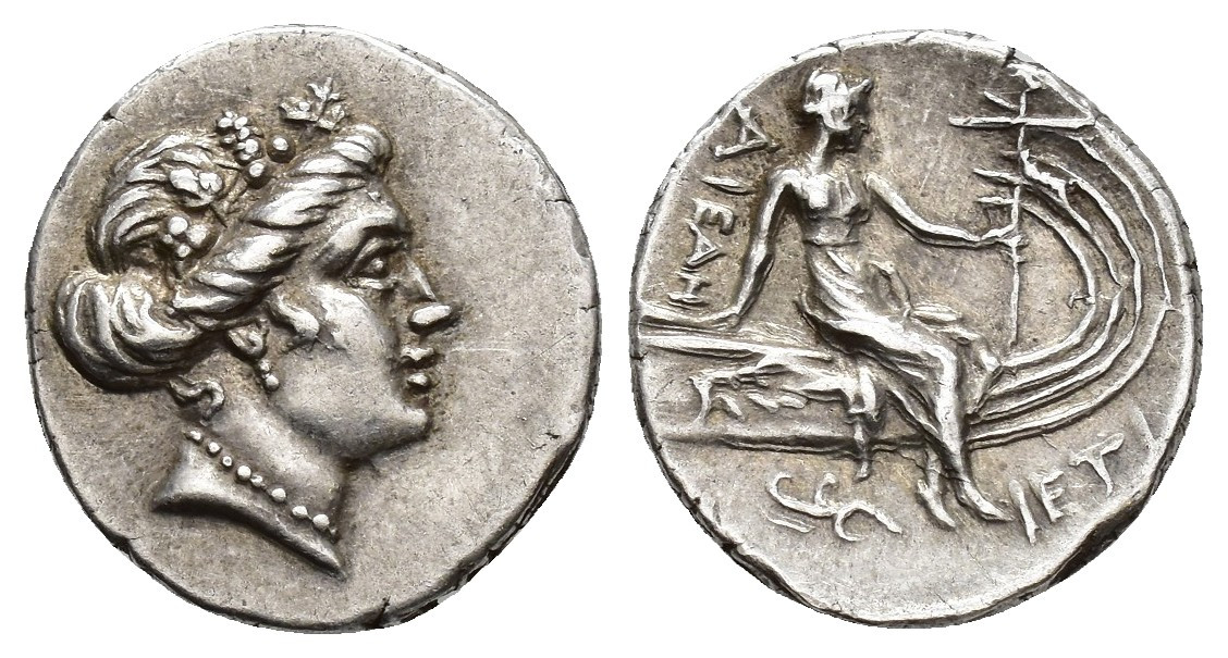 GRECIA ANTIGUA. EUBEA. Histiaia. Tetróbolo (300-200 a.C.). A/ Cabeza de Ménade con corona de hojas de parra a der. R/ Ninfa sentada en proa de nave, debajo ¿aplustre? AR 2,36 g. 15,8 mm. COP-no; SBG-2496. MBC+.