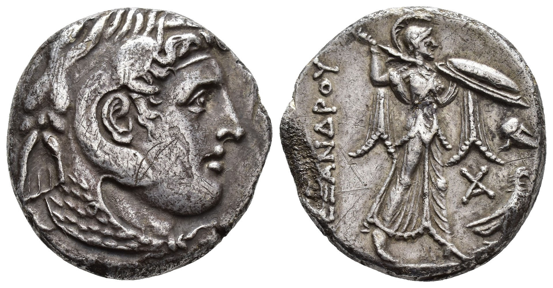 GRECIA ANTIGUA. REINO PTOLEMAICO. Ptolomeo I. Tetradracma. A/ Cabeza de Alejandro con exuviae elephantis y cuernos de Amón y égida a der. R/ Atenea blandiendo escudo a der., delante casco y águila y monograma. AR 14,74 g. 26,3 mm. COP-12 var. monogr. Rayas. MBC/MBC+.