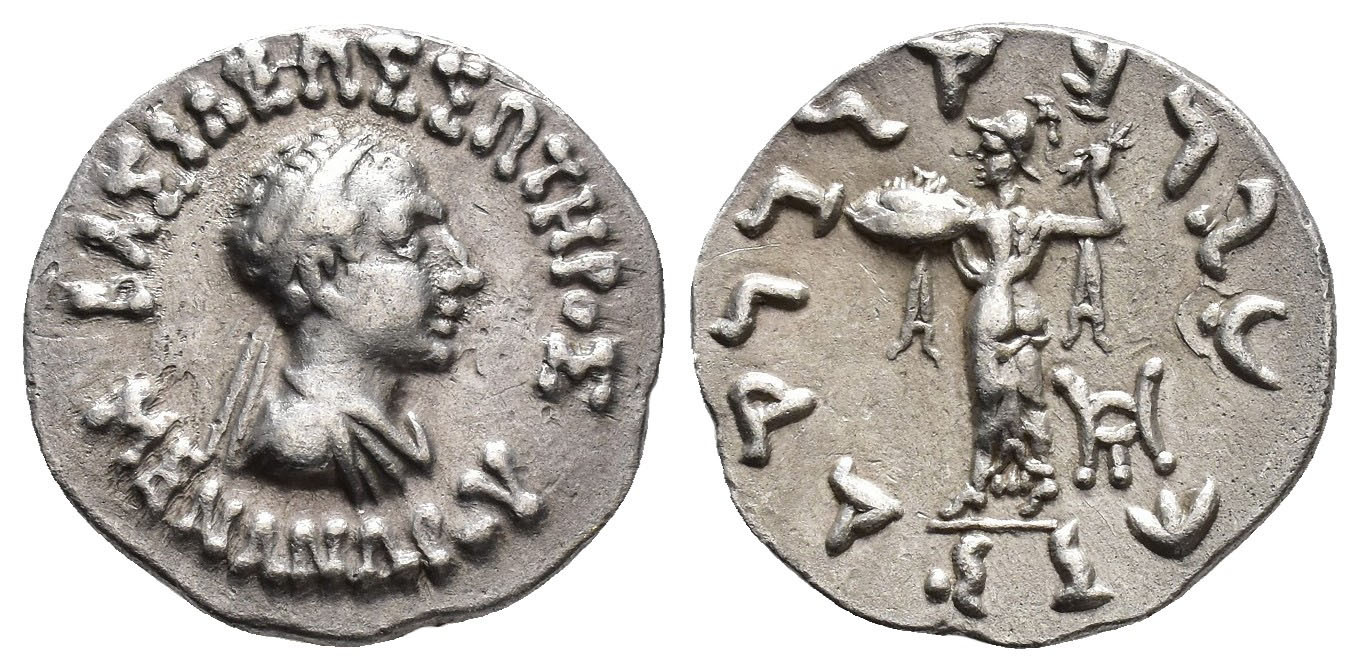 GRECIA ANTIGUA. BACTRIA. Menandro I. Dracma (160-146 a.C.). A/ Cabeza diademada a der. R/ Atenea con rayos y escudo a izq., detrás monograma. AR 2,46 g. 17,3 mm. COP-291. MBC/MBC+.