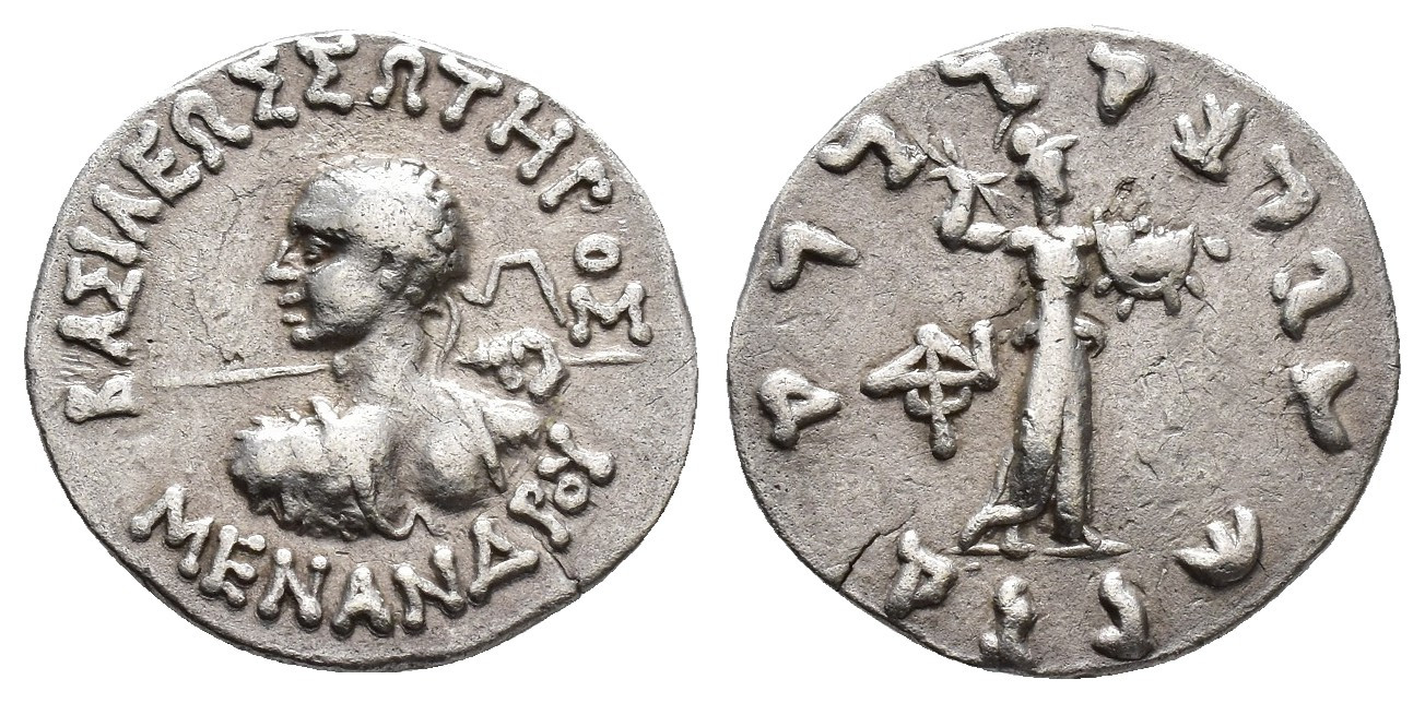 GRECIA ANTIGUA. BACTRIA. Menandro I. Dracma (155-130 a.C.). A/ Busto diademado con lanza y égida a izq. R/ Atenea con rayos y escudo a der., detrás monograma. AR 2,42 g. 16,6 mm. COP-298 ss. Var. monograma. MBC.