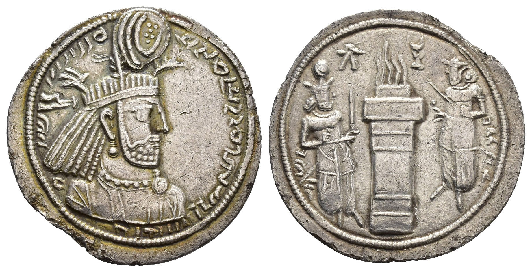 GRECIA ANTIGUA. IMPERIO SASÁNIDA. Narseh. Dracma (293-302). A/ Busto a der. R/ Altar de fuego flanqueado por dos personajes. AR 4,03 g. 25,1 mm. SES-95. Golpecito en anv. MBC+.