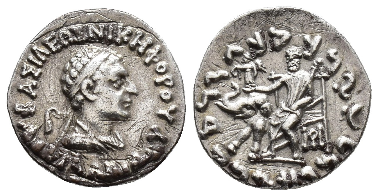 GRECIA ANTIGUA. IMPERIO INDO-ESCITA. Antialcidas. Dracma (130-95 a.C.). A/ Busto diademado a der. R/ Zeus sentado a izq. con victoria, debajo del trono monograma y delante elefante. AR 2,33 g. 17,4 mm. COP-316 var. monogr. Finas rayas. MBC/MBC+.