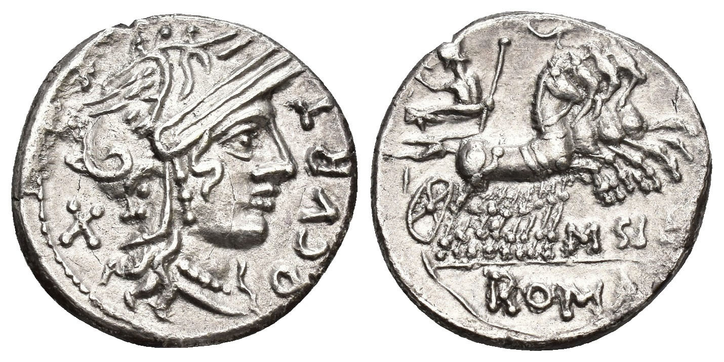REPÚBLICA ROMANA. CURTIA. Quintus Curtius. Denario. Norte de Italia (116-115 a.C.). A/ Cabeza de Roma a der., delante Q CVRT. R/ Júpiter en cuadriga a der., encima lituus; M SI(L)A/ ROMA. AR 3,88 g. 18,5 mm. CRAW-285.2; FFC-669. Concreciones. Ebc.
