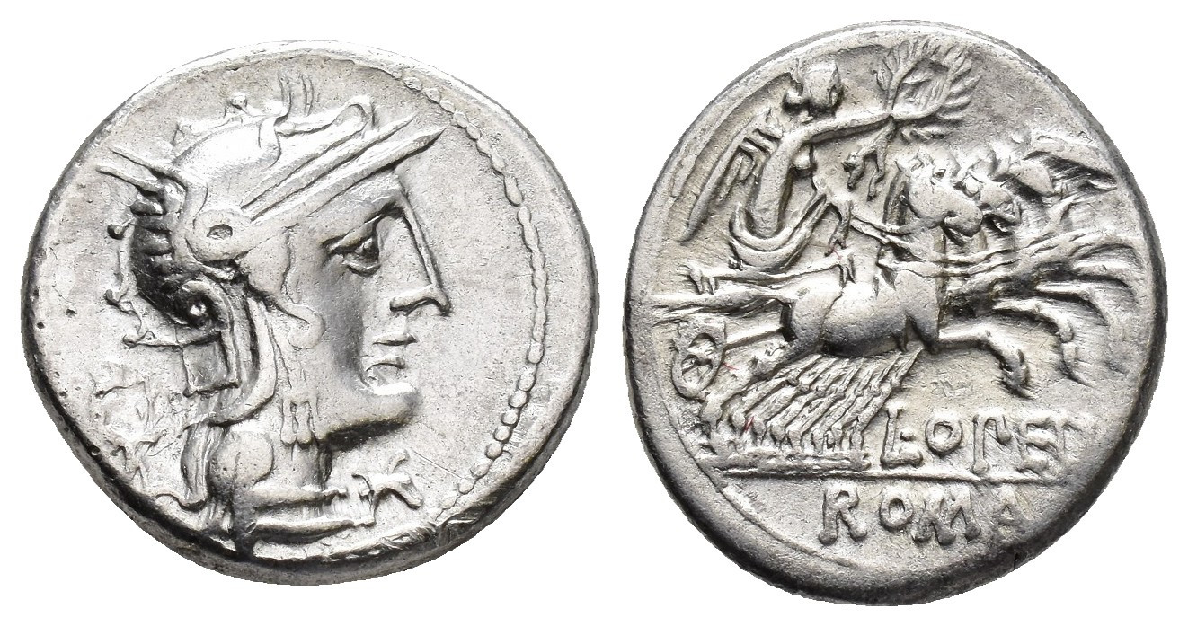 REPÚBLICA ROMANA. OPIMIA. Denario. Roma (131 a.C.). A/ Cabeza de Roma a der., detrás corona. R/ Victoria en cuadriga a der.; L OPEI(MI) en exergo ROMA. AR 3,91 g.; 17 mm. CRAW-253.1; FFC-949. MBC.
