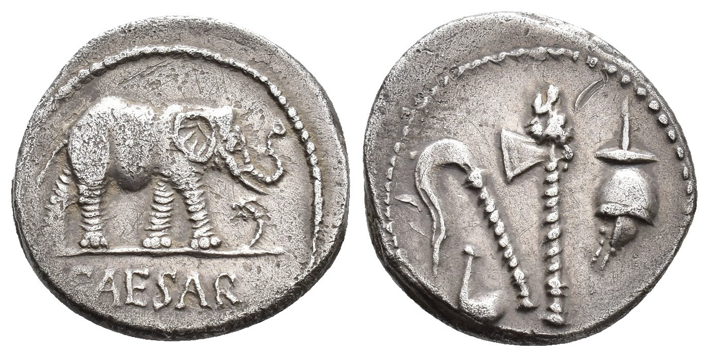 PERIODO DE JULIO CÉSAR A AUGUSTO. JULIO CÉSAR. Denario. Galia. Ceca móvil (49-48 a.C.). A/ Elefante asiático a der. pisando carnyx galo; CAESAR. R/ Instrumentos pontificales. AR 3,87 g. 18 mm. CRAW-443.1; FFC-50. Pequeñas erosiones y rayitas en rev. MBC.
