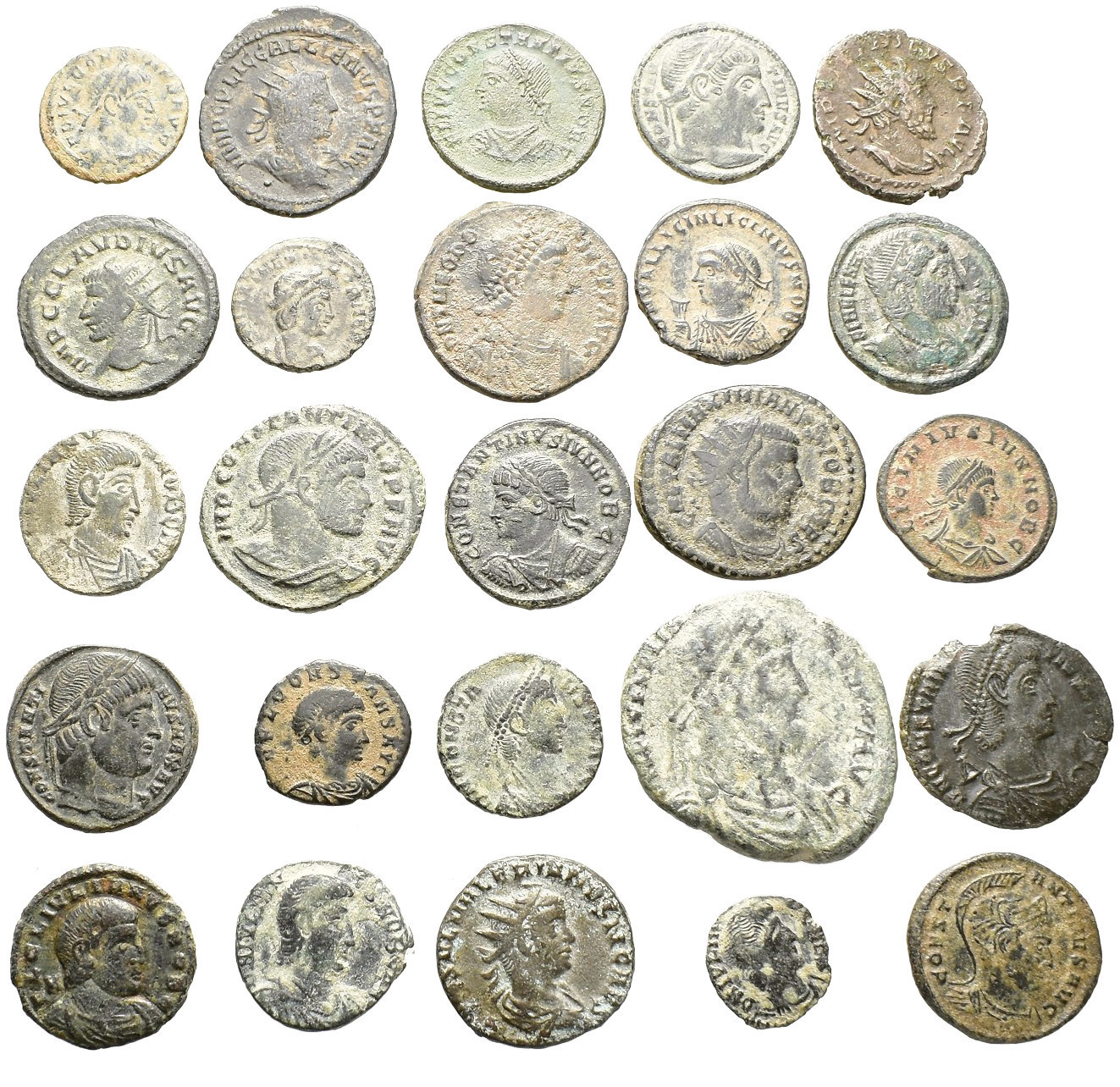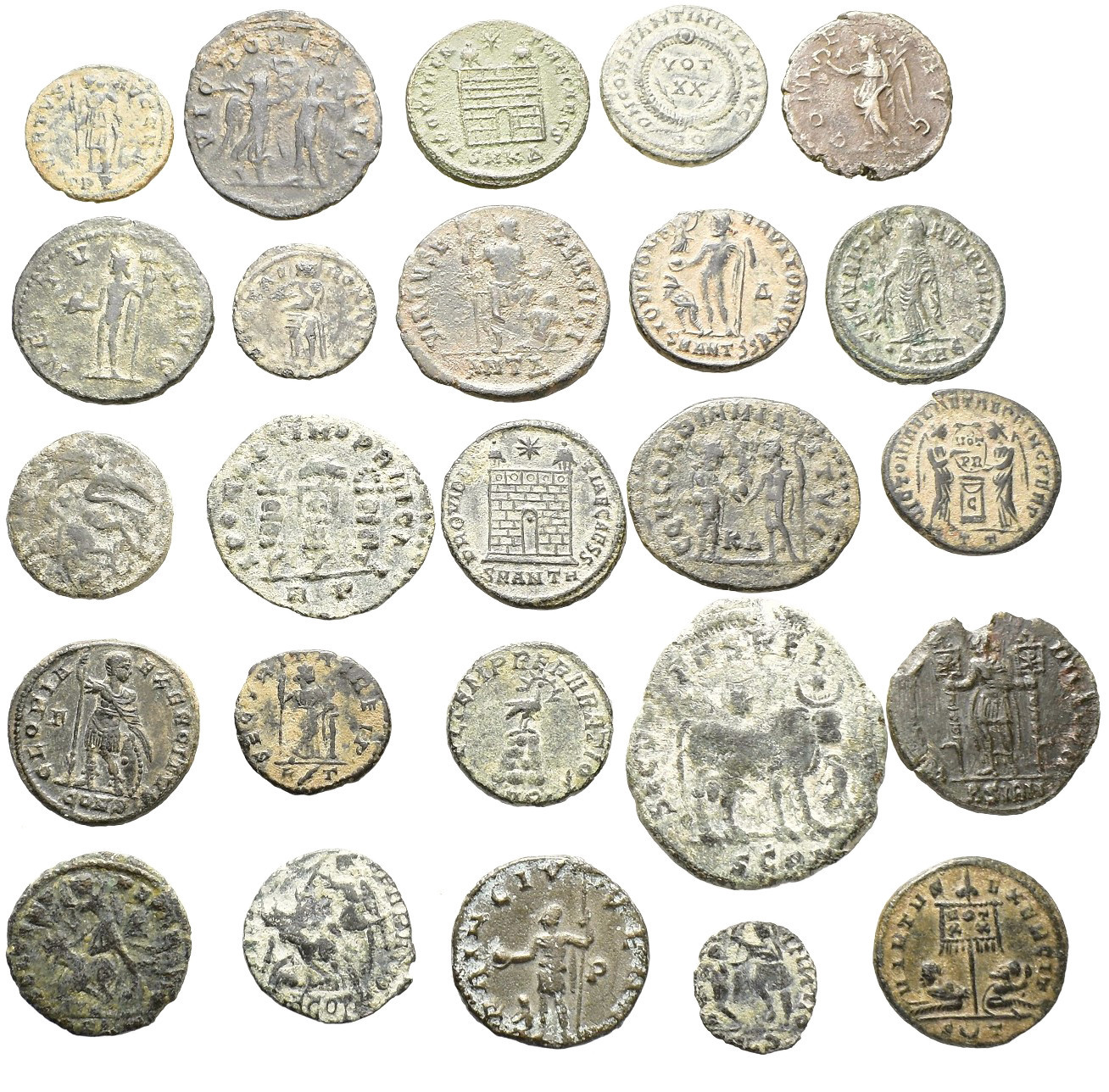 IMPERIO ROMANO. Lote de 25 bronces: 4 antoninianos y 21 follis, casi todos de módulo pequeño y mediano. De BC- a MBC.