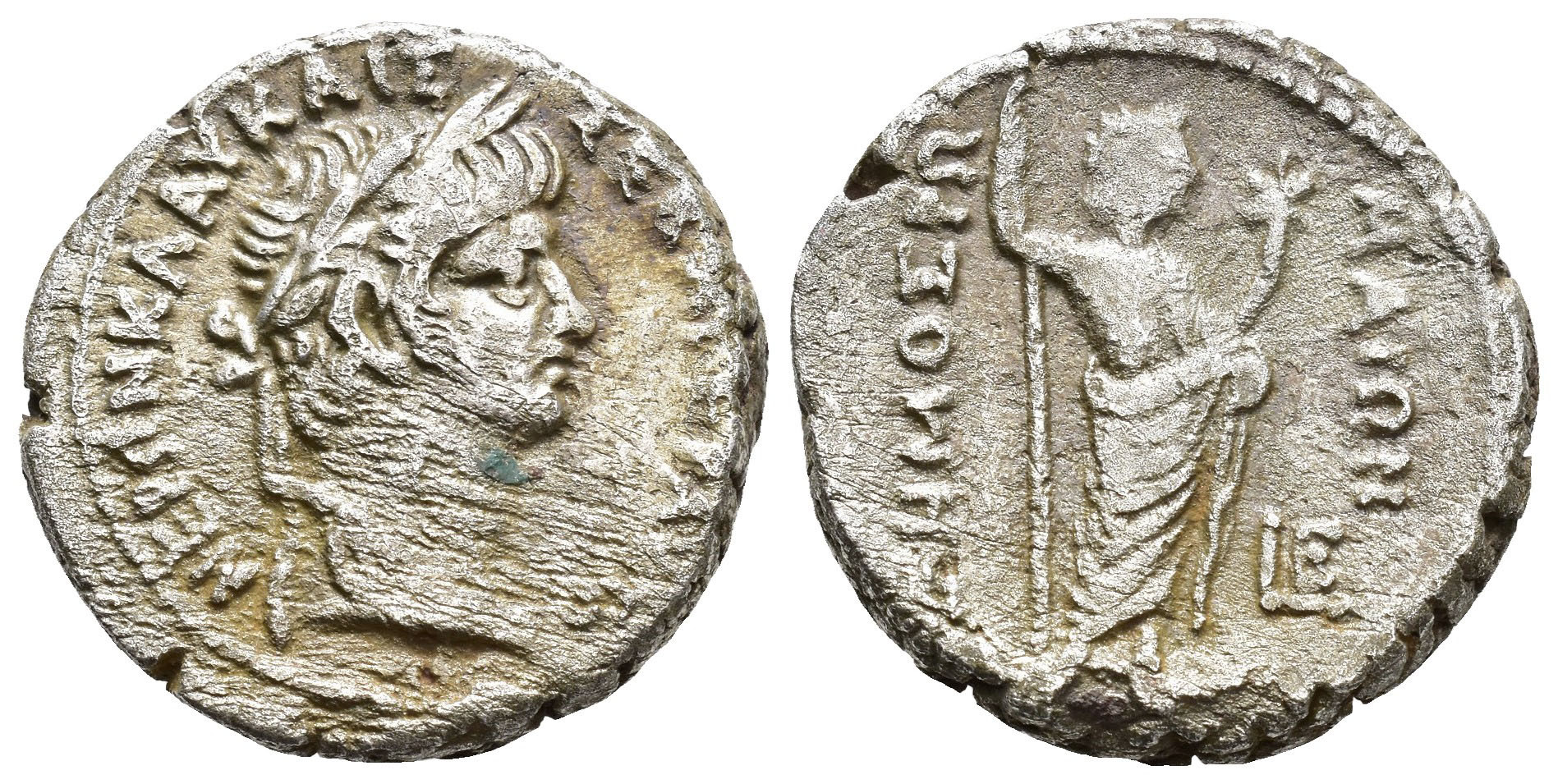 IMPERIO ROMANO. NERÓN (54-68 d.C.). Tetradracma. Alejandría (58-59 d.C.). A/ Cabeza laureada a der. R/ Genio del Pueblo Romano a der. con cetro y cornucopia; LE. VE 10,42 g. 25,2 mm. RPC-I.5243. Erosiones. BC+/MBC-.