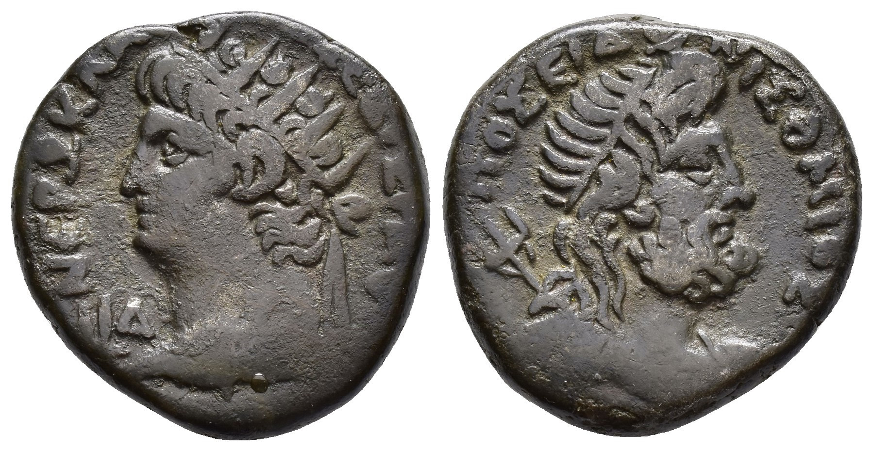 IMPERIO ROMANO. NERÓN (54-68 d.C.). Tetradracma. Alejandría (67-68 d.C.). A/ Cabeza radiada a izq.; LID. R/ Busto de Poseidón a der., detrás tridente. VE 12,65 g. 24,2 mm. RPC-I.5310. MBC-.