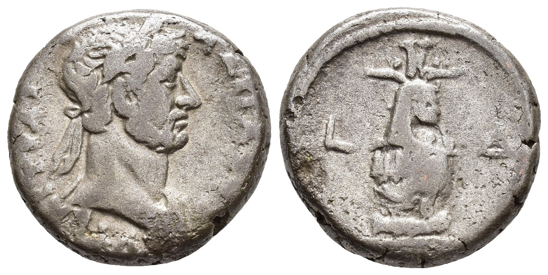 IMPERIO ROMANO. ADRIANO (117-138). Tetradracma. Alejandría (119-120). A/ Cabeza laureada y drapeada al hombro a der. R/ Vaso canopo a der., L-D. VE 13,13 g. 22,6 mm. RPC-III.5198. Pequeñas erosiones. MBC-/BC+.