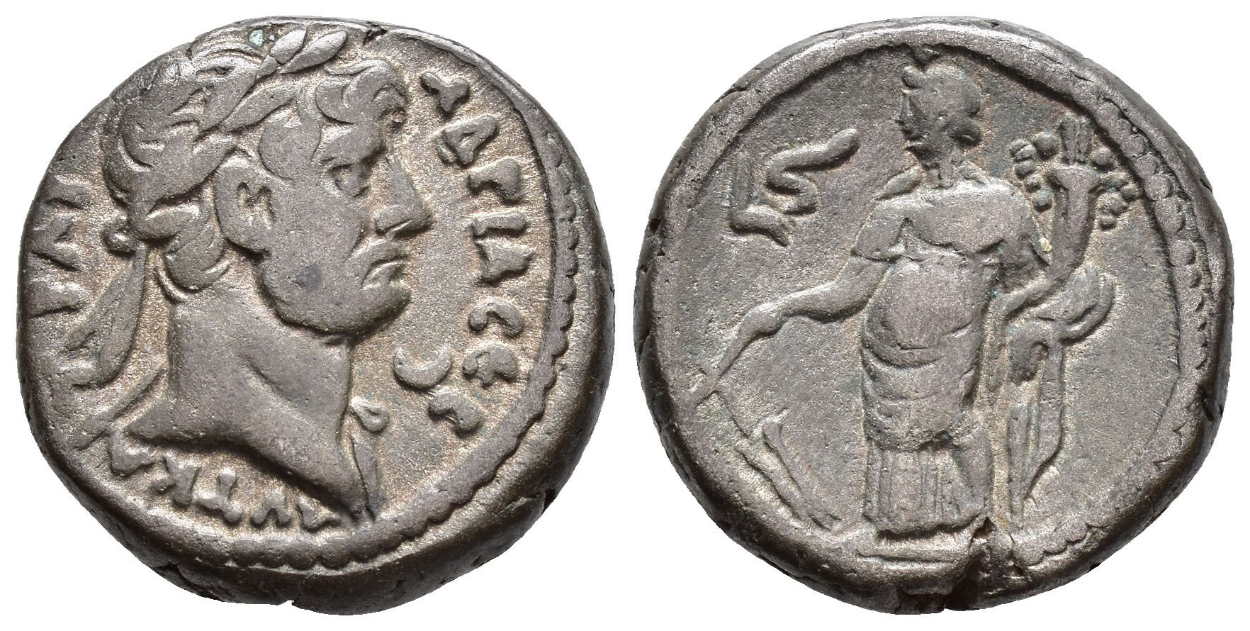 IMPERIO ROMANO. ADRIANO (117-138). Tetradracma. Alejandría (121-122). A/ Cabeza laureada y drapeada al hombro a der.; delante creciente. R/ Tyche a izq. con timón y cornucopia, L S. VE 12,99 g. 23,6 mm. RPC-III.5342. MBC/MBC-.