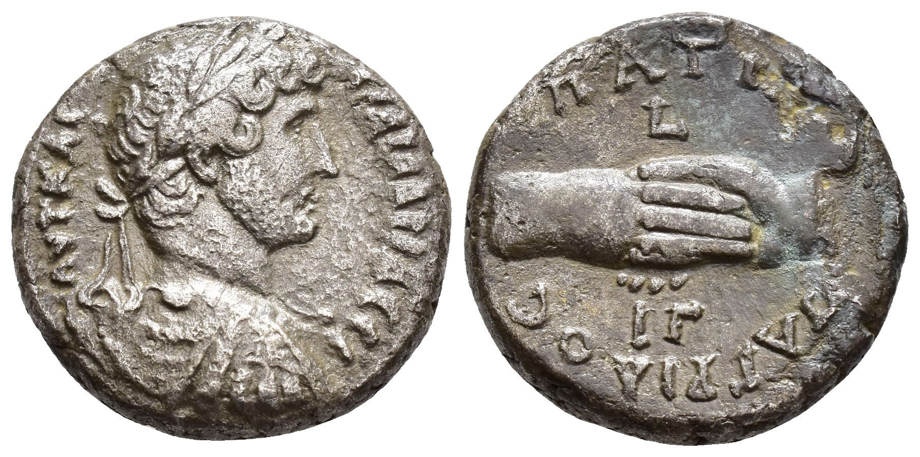 IMPERIO ROMANO. ADRIANO (117-138). Tetradracma. Alejandría (128-129). A/ Busto laureado, drapeado y con coraza a der. R/ Manos estrechadas. VE 12,47 g. 23,1 mm. RPC-III.5728. Erosiones. MBC.