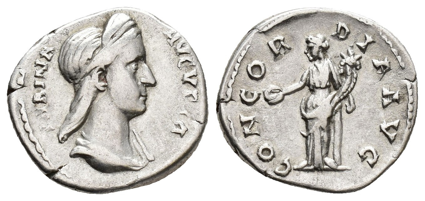IMPERIO ROMANO. SABINA. Denario. Roma (136-138). A/ Busto diademado y drapeado a der.; SABINA AVGVSTA. R/ Concordia a izq. con pátera y cornucopia; CONCORDIA AVG. AR 3,57 g. 17,4 mm. RIC-2571. MBC-/MBC. Escasa.