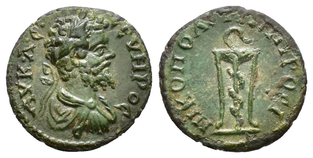 IMPERIO ROMANO. SEPTIMIO SEVERO (193-211). AE. Nicópolis ad Istrum (193-211). A/ Busto laureado, drapeado y acorazado a der. R/ Serpiente enroscada en trípode. AE 1,82 g. 16,1 mm. Pátina verde. EBC/EBC-.
