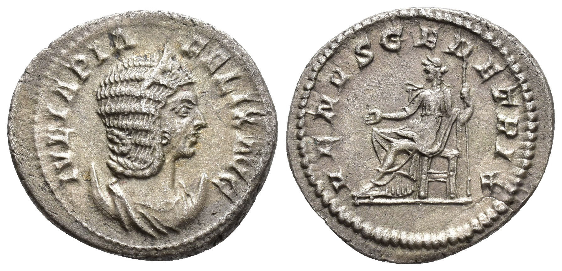 IMPERIO ROMANO. JULIA DOMNA (bajo Caracalla). Antoniniano. Roma (211-217). A/ Busto diademado y drapeado a der. sobre creciente; IVLIA PIA FELIX AVG. R/ Venus sentada a izq. con cetro; VENVS GENETRIX. VE 4,76 g. 22,3 mm. RIC-388A. MBC.