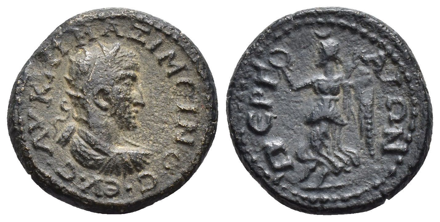 IMPERIO ROMANO. MÁXIMO (235-238). AE-19. Perge (Panfilia) (235-238). A/ Busto radiado, drapeado y acorazado a der. R/ Victoria avanzando a izq. con láurea. AE 3,99 g. 18,8 mm. RPC-VI.6180. Pátina oscura. MBC-/MBC.