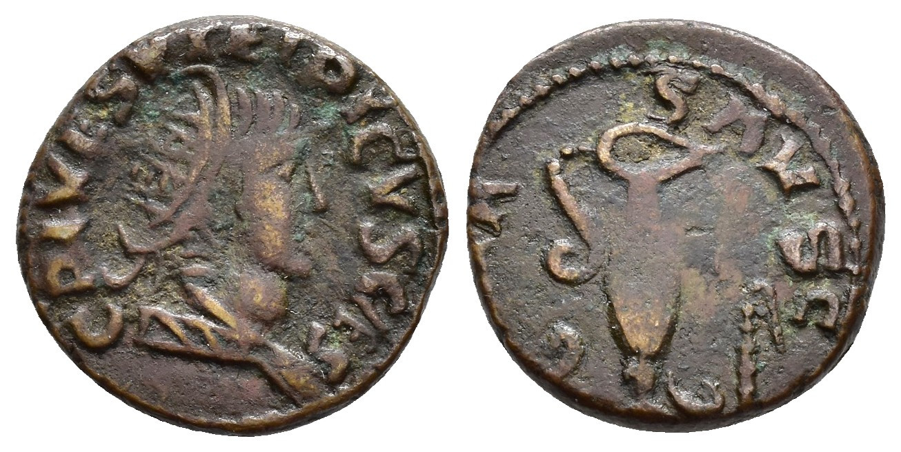 IMPERIO ROMANO. TÉTRICO II (270-274). Antoniniano. ¿Colonia? (273-274). A/ Imitación bárbara. Busto radiado y drapeado a der. CPIVIS(…)TETRICVS CAES. R/ Instrumentos sacerdotales; ley. poco inteligible. AE 3,32 g. 16,8 mm. MBC-/BC+.
