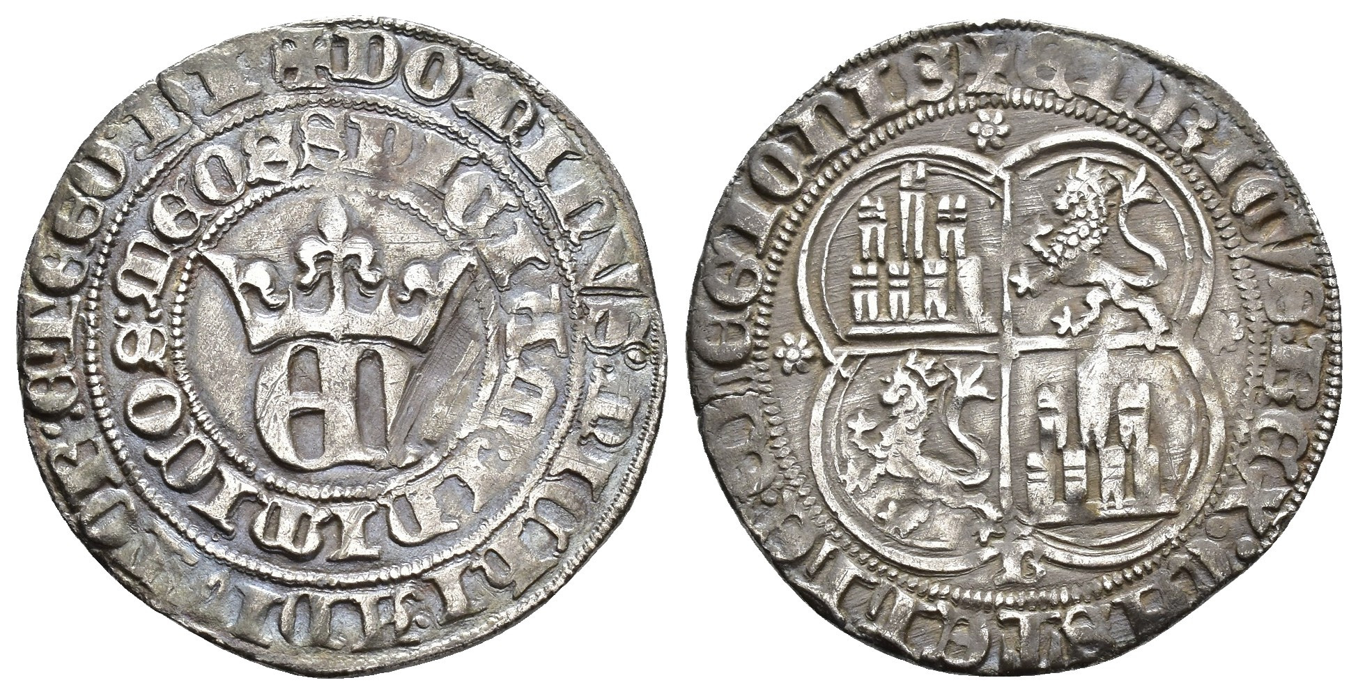 REINOS DE CASTILLA Y LEÓN. ENRIQUE II (1367-1379). Real. Burgos. AR 3,35 g. 26,7 mm. III-401; BMM-555. Raya en anv. MBC. Muy escasa.