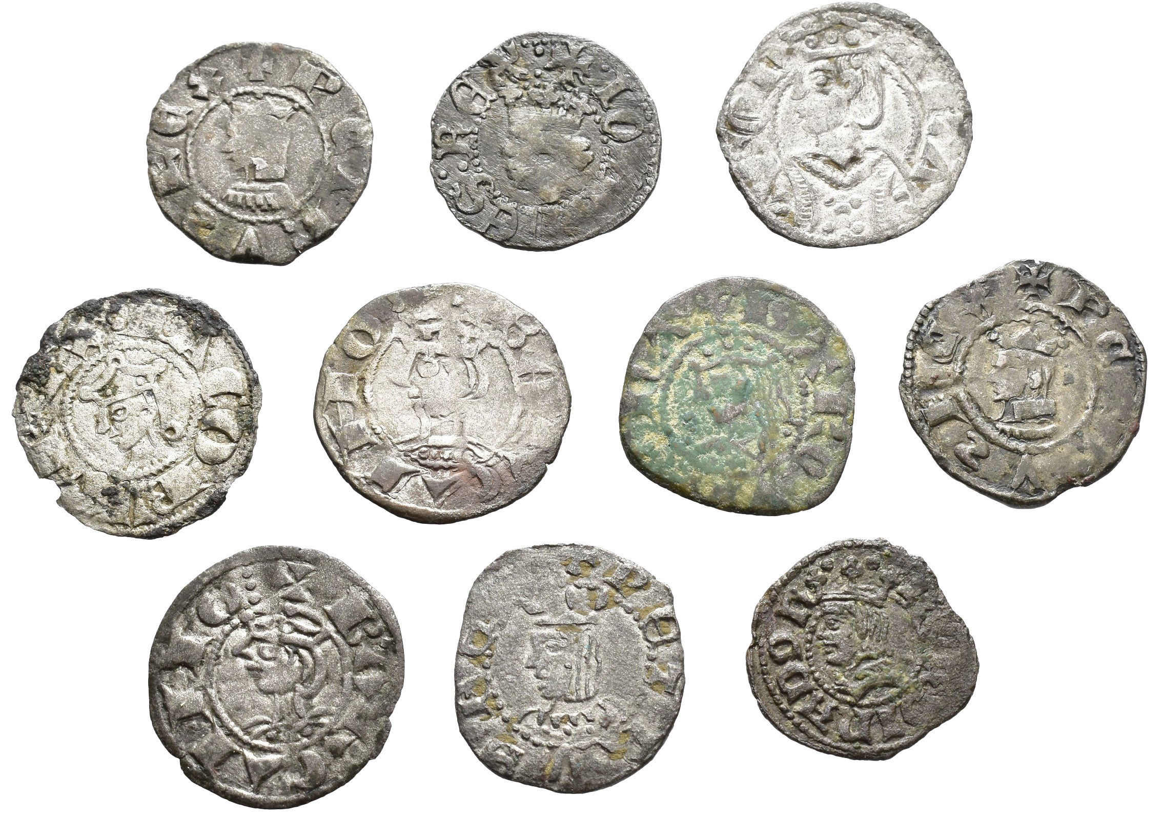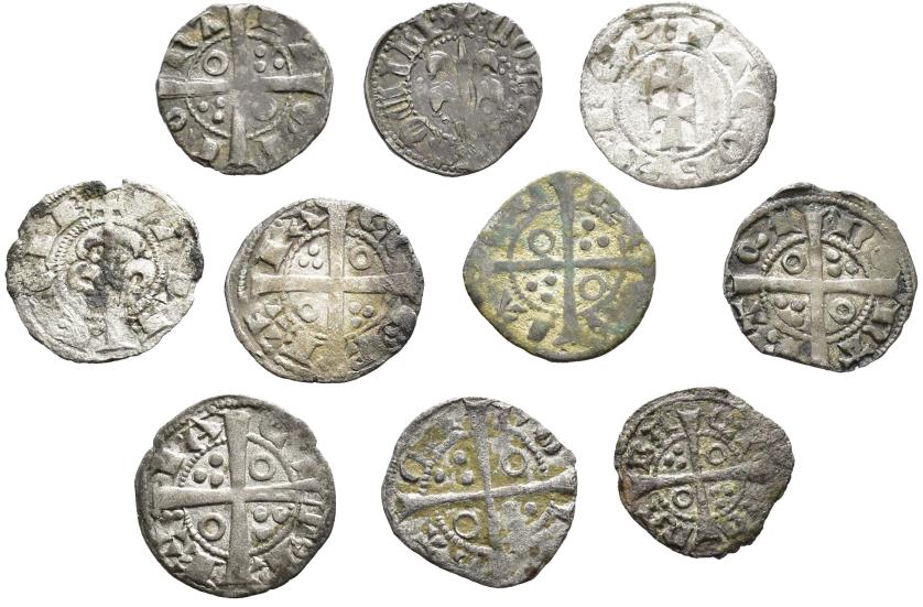 CORONA DE ARAGÓN. Lote de 10 piezas: dinero de Alfonso I-II, Jaime I (2), Pedro II y Pedro III (2), 1 diner de Barcelona Felipe V y 3 piezas más. BC+/MBC.
