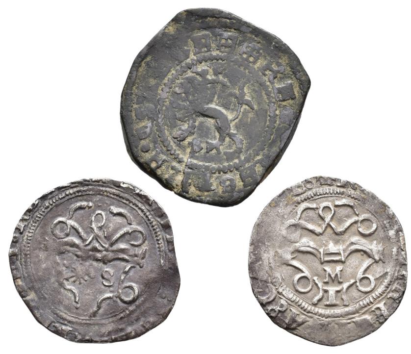 REYES CATÓLICOS. Lote de 3 piezas: 2 maravedís Burgos, 1/2 real (2) Sevilla y Toledo. MBC-/MBC.