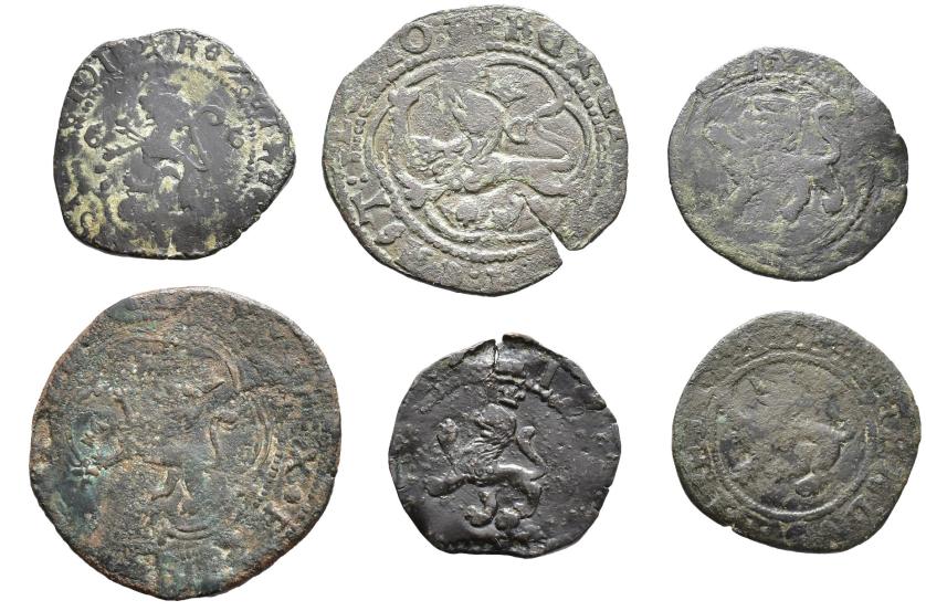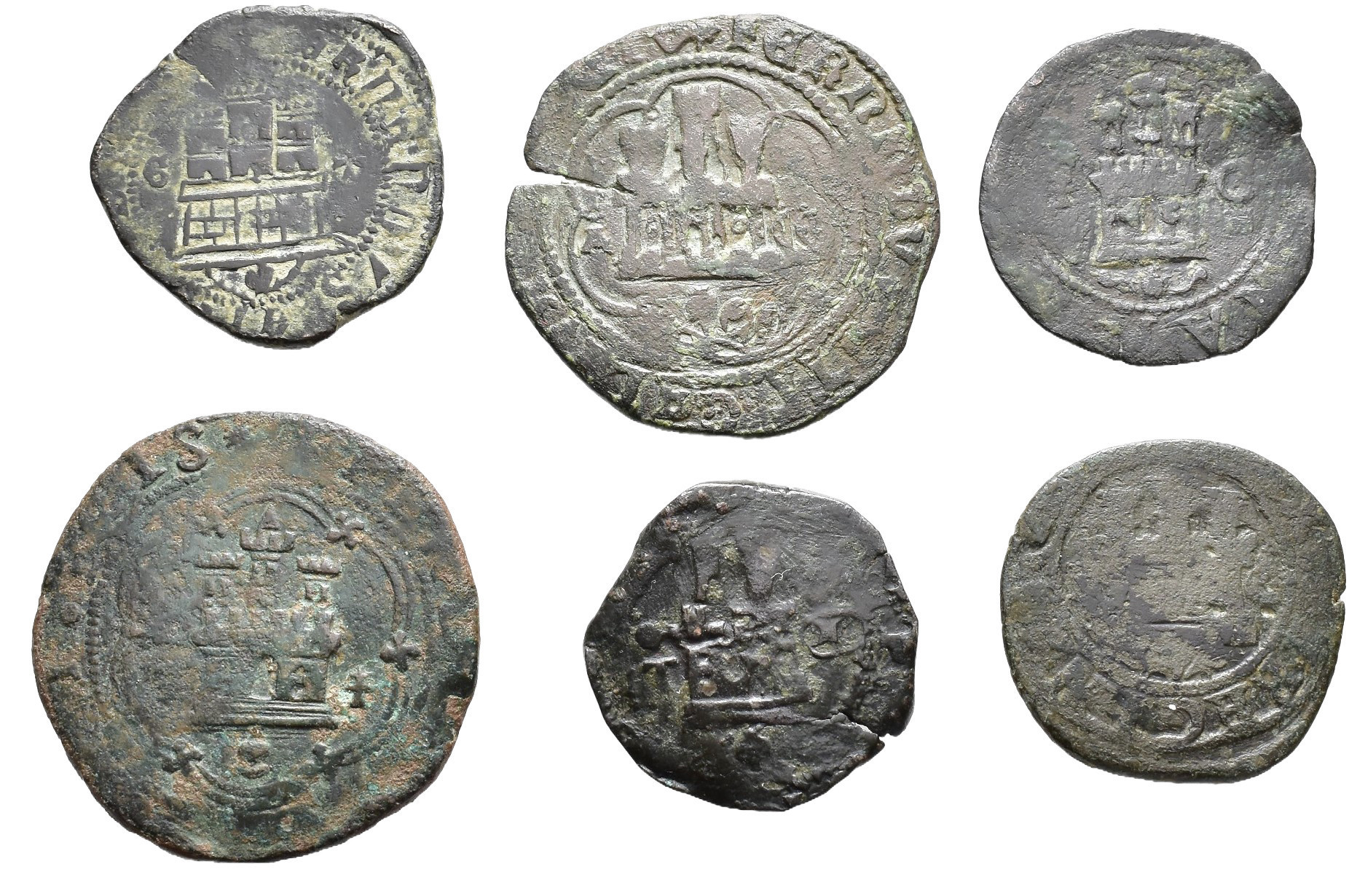 REYES CATÓLICOS. Lote de 6 piezas: 2 maravedís (4), una de ellas de Felipe II, y 4 maravedís (2): Coruña y Cuenca. BC-/BC+.