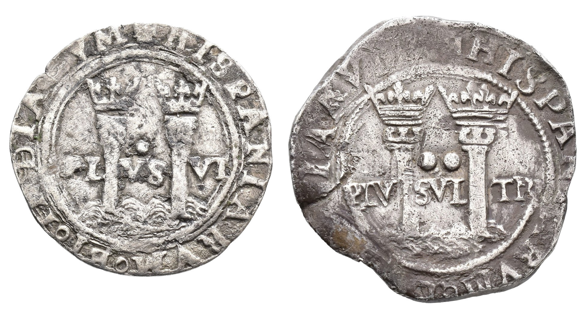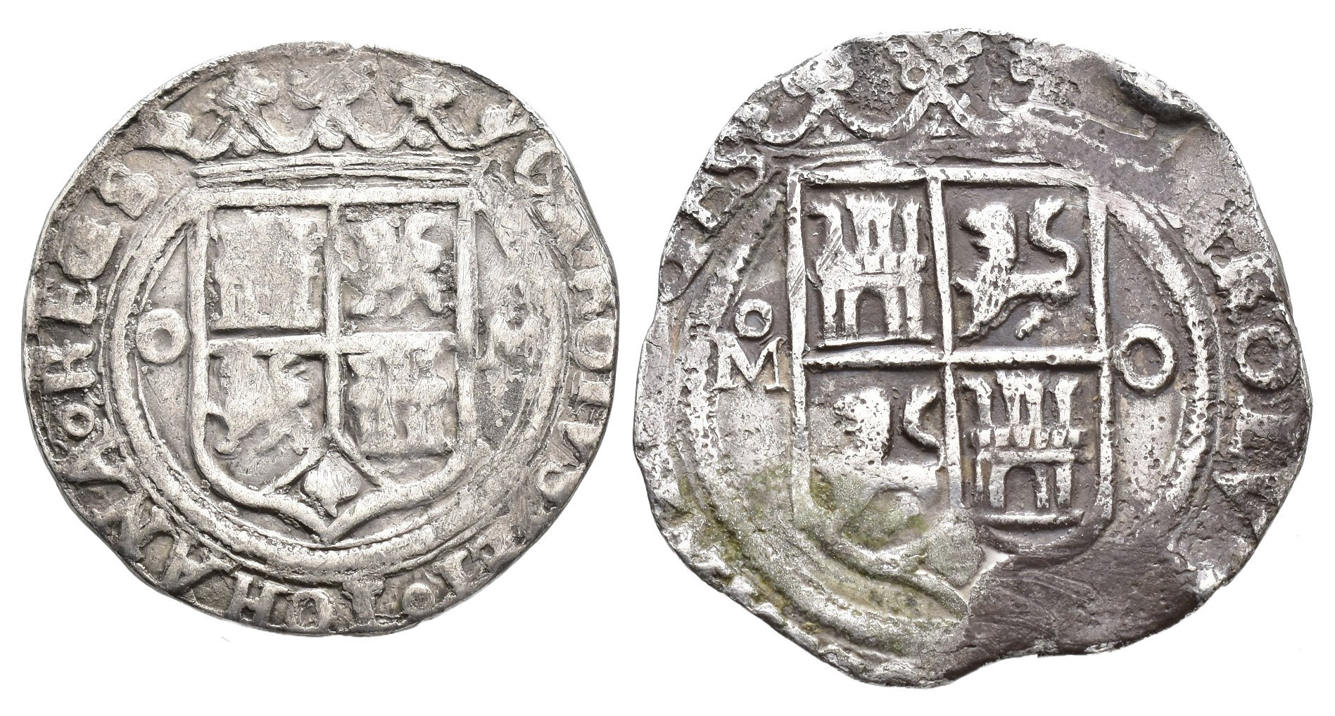 JUANA Y CARLOS. Lote de 2 piezas: 1 y 2 reales de México, R-O. BC+/MBC-.