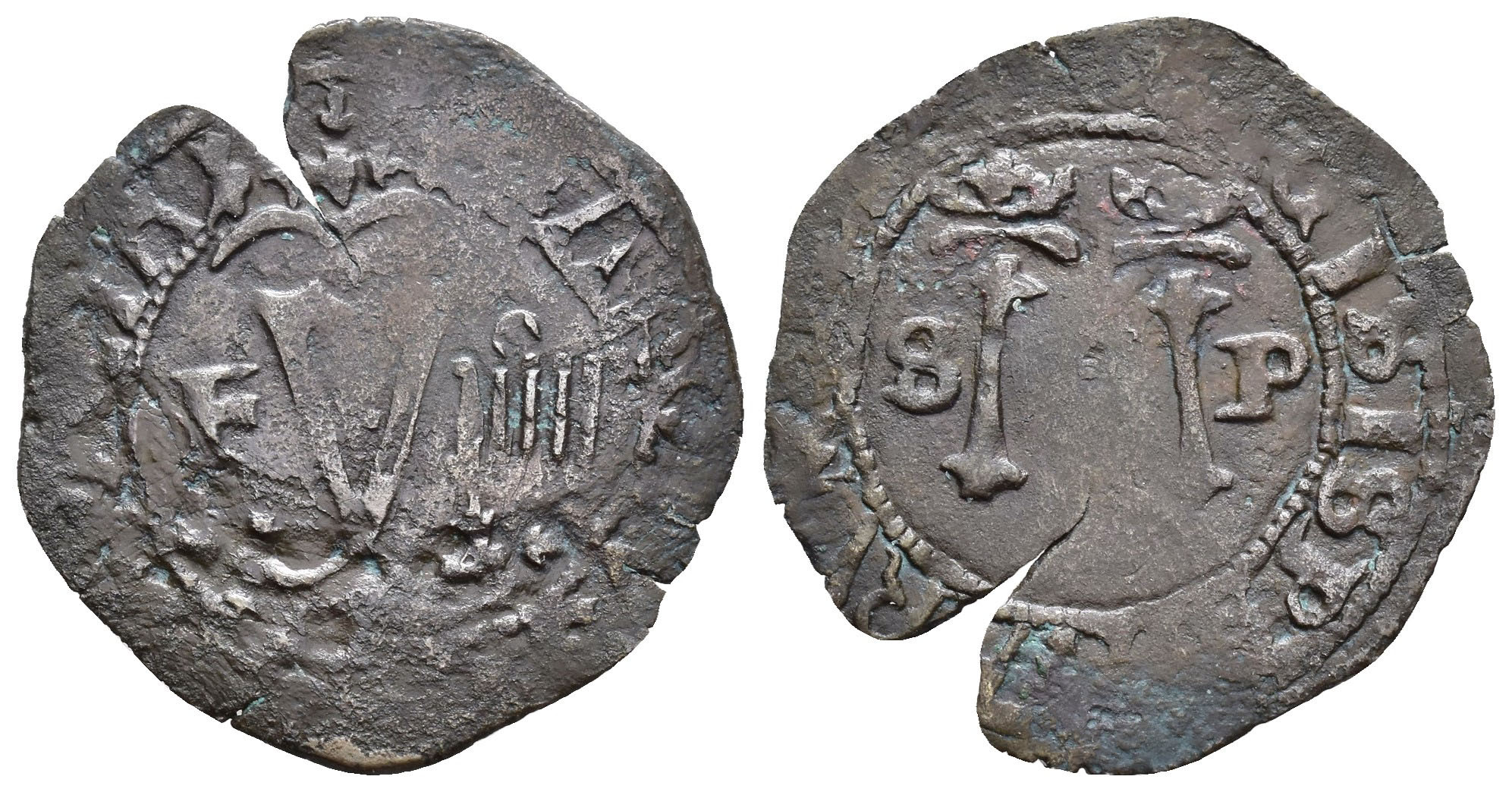JUANA Y CARLOS. 4 maravedís. Santo Domingo. Valor IIII. F/S P. CU 2,09 g. 28,5 mm. AC-35. Cospel abierto. MBC-/MBC.