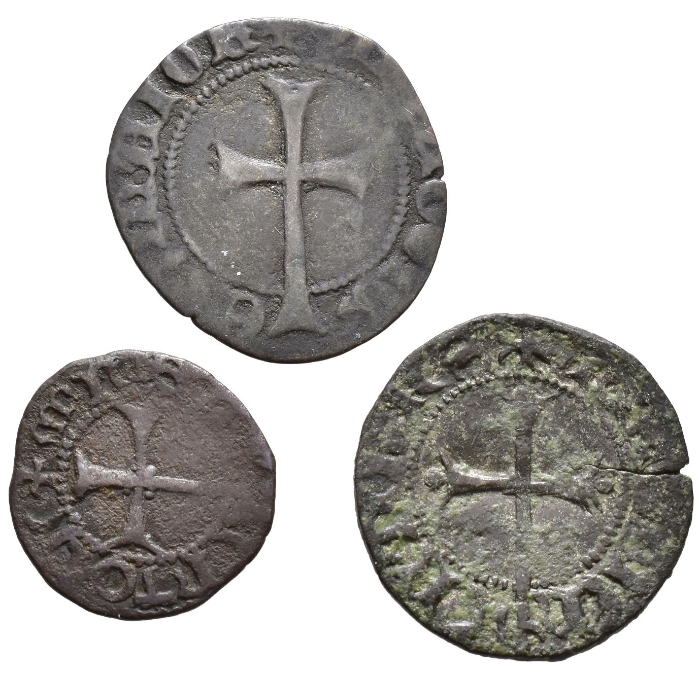 FELIPE II. Lote de 3 piezas de Mallorca: 1 dobler de Alfonso V y 1 diner y un dobler de Felipe II. BC/BC+.