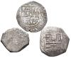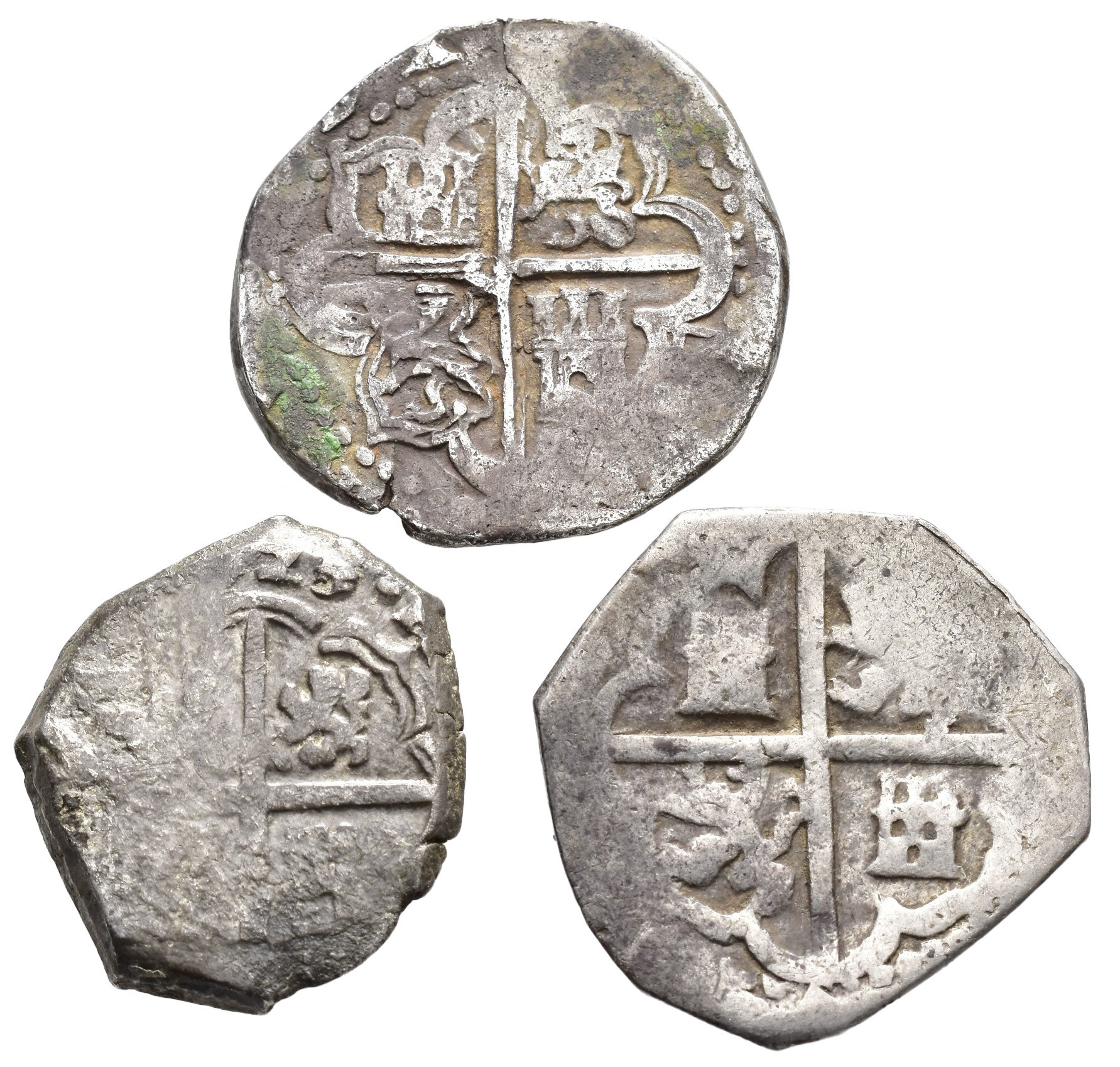 FELIPE II. Lote de 3 monedas de 2 reales: 2 de Toledo de Felipe II -C y sin marcas- y una de Felipe III 1625 S.C. BC/BC+.