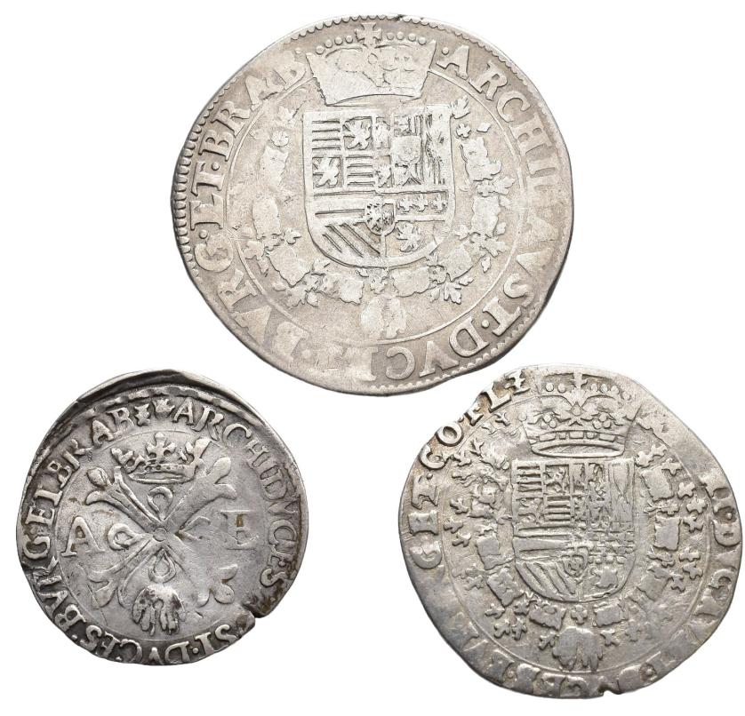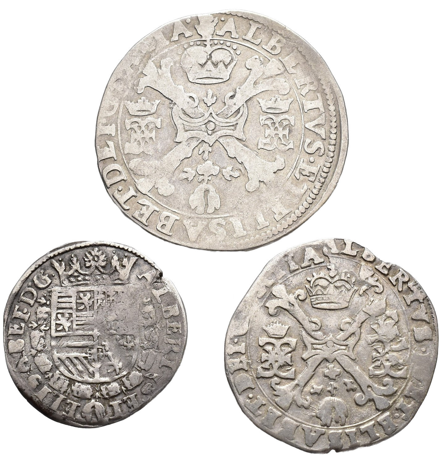 ALBERTO E ISABEL. Lote de 3 piezas: 1/4 patagón sin ceca, 1/2 patagón Amberes y 1 real de Amberes sin fecha. MBC-.