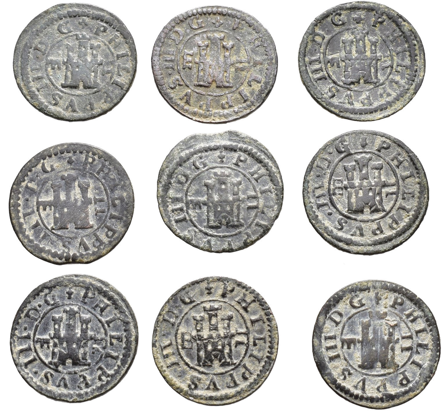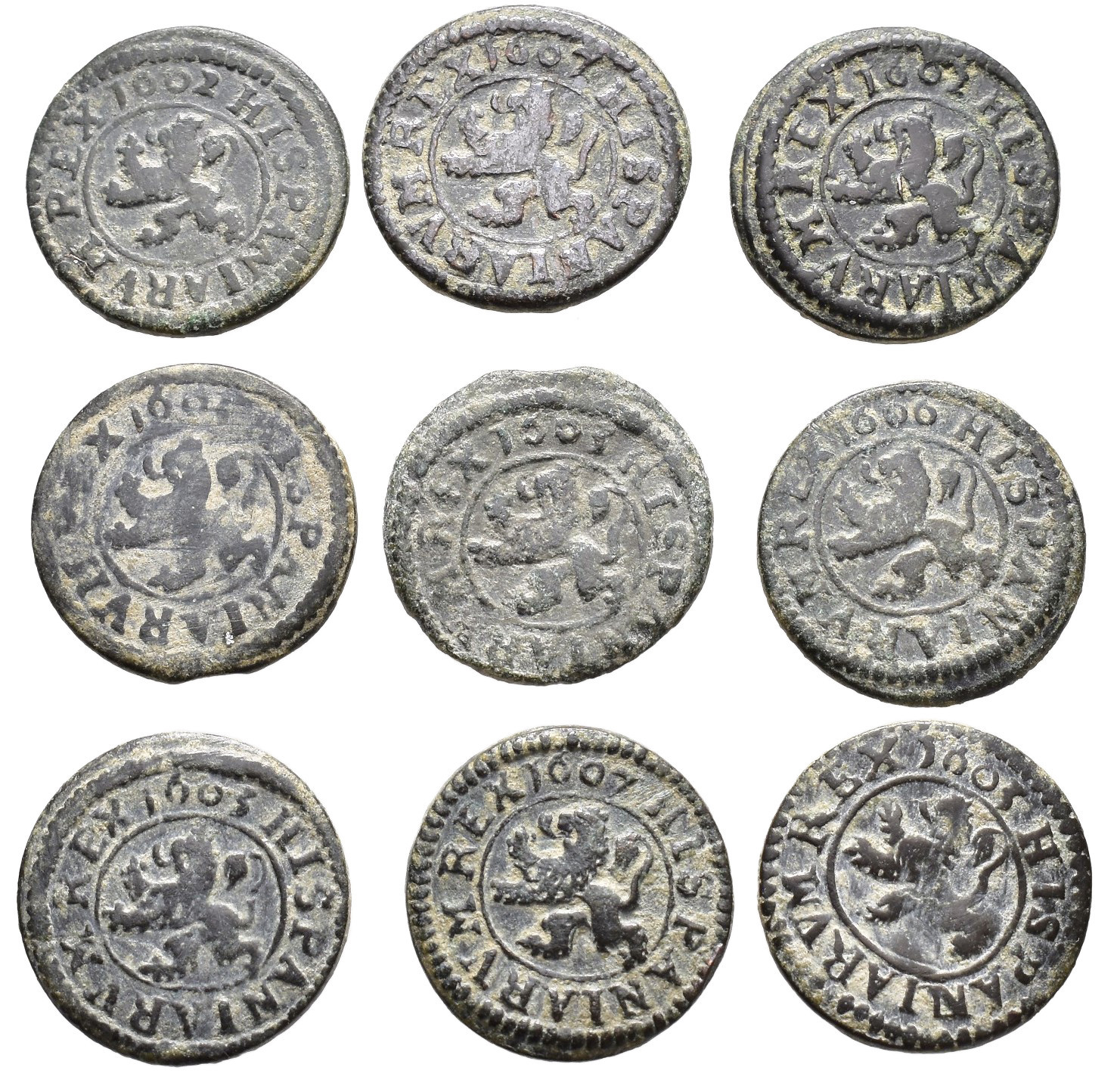 FELIPE III. Lote de 9 piezas de 2 maravedís de Segovia: 1602 (2), 1603 (4), 1606 y 1607 (2). BC+/MBC.