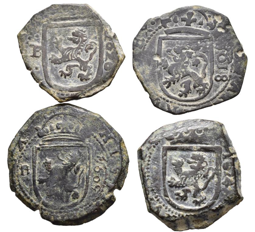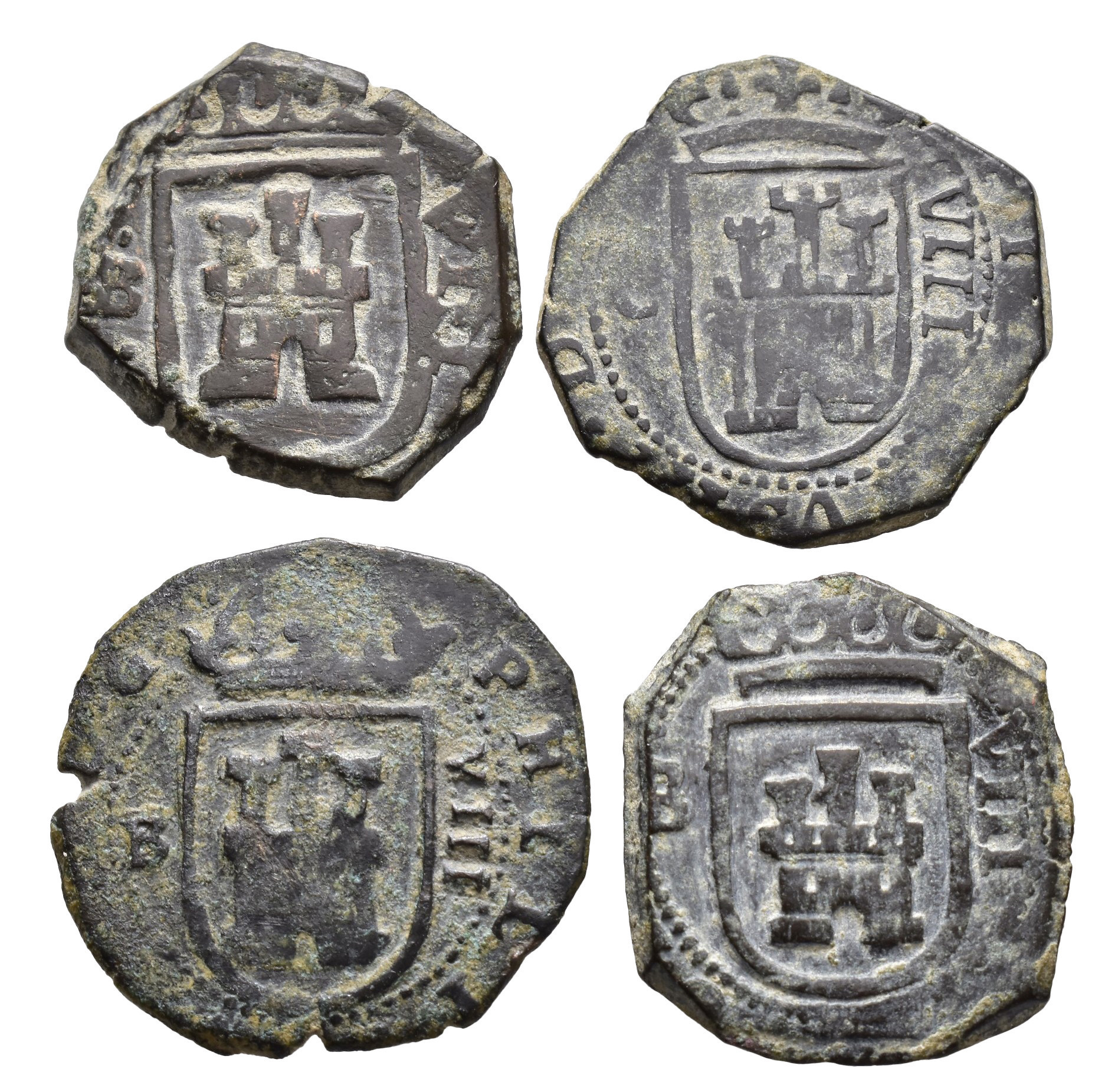 FELIPE IV. Lote de 4 piezas: 8 maravedís de Felipe III -2: 1605 Burgos y 1618 Cuenca-, y 8 maravedís de Felipe IV -2: Burgos 1624 y 1626-. BC+/MBC.
