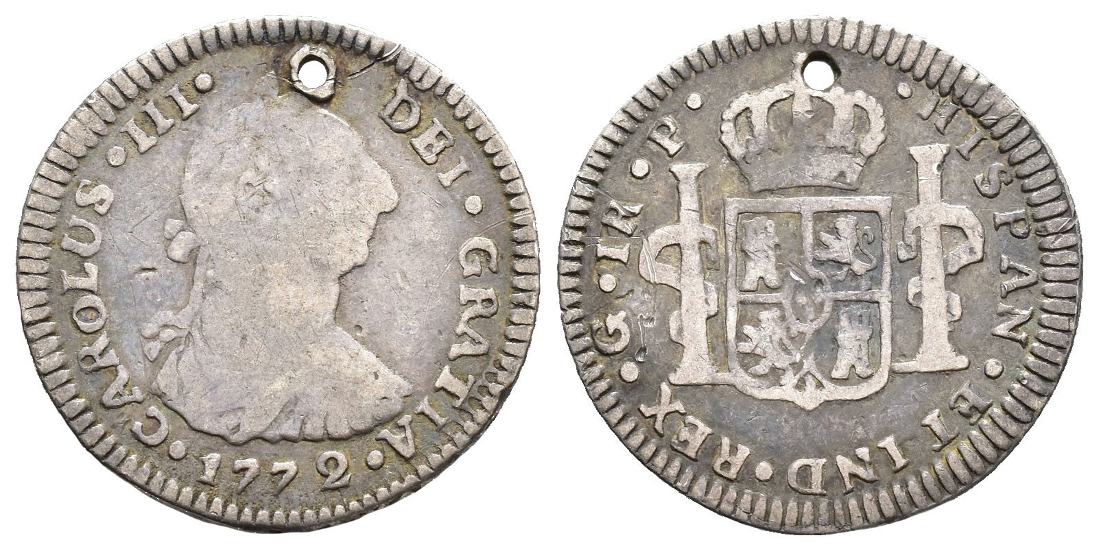 CARLOS III. Real. 1772. Guatemala. P. AR 3,3 g. 21,2 mm. VI-271; AC-332. Agujero. Pequeñas marcas. BC+. Escasa.