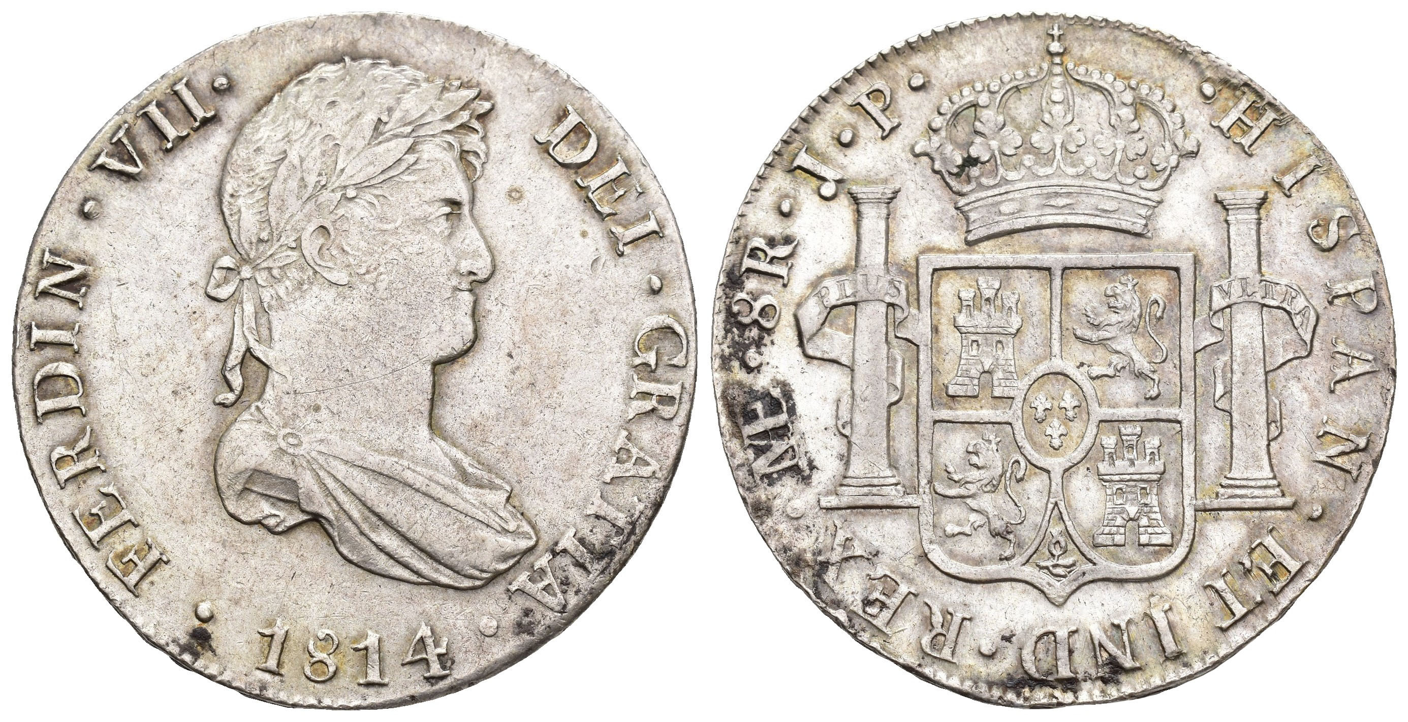 FERNANDO VII. 8 reales. 1814. Lima. JP. AR 27,17 g. 38,6 mm. VI-1045; AC-1247. Pequeñas oxidaciones. MBC+/EBC-.